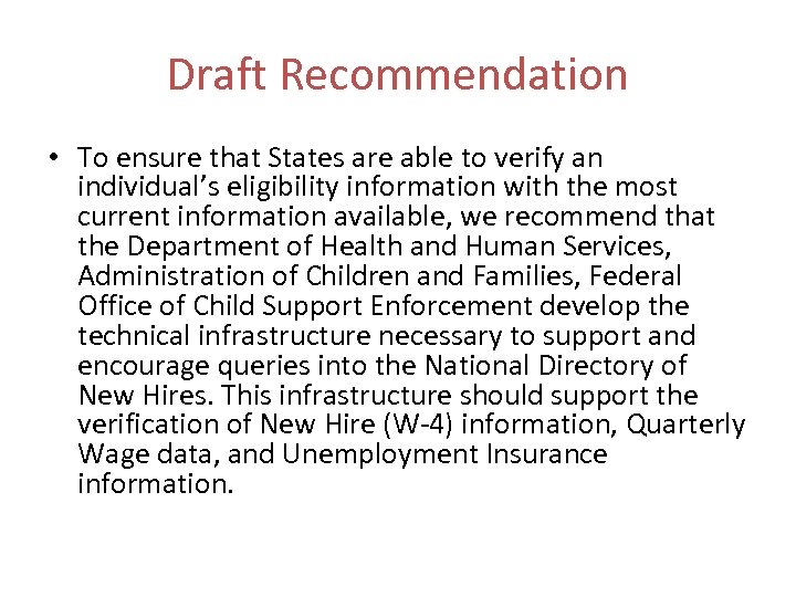 Draft Recommendation • To ensure that States are able to verify an individual’s eligibility information with the most current information available, we recommend that the Department of Health and Human Services, Administration of Children and Families, Federal Office of Child Support Enforcement develop the technical infrastructure necessary to support and encourage queries into the National Directory of New Hires. This infrastructure should support the verification of New Hire (W-4) information, Quarterly Wage data, and Unemployment Insurance information.