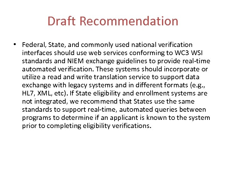 Draft Recommendation • Federal, State, and commonly used national verification interfaces should use web services conforming to WC 3 WSI standards and NIEM exchange guidelines to provide real-time automated verification. These systems should incorporate or utilize a read and write translation service to support data exchange with legacy systems and in different formats (e. g. , HL 7, XML, etc). If State eligibility and enrollment systems are not integrated, we recommend that States use the same standards to support real-time, automated queries between programs to determine if an applicant is known to the system prior to completing eligibility verifications.