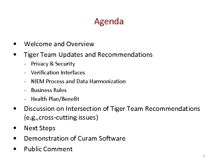 Agenda • Welcome and Overview • Tiger Team Updates and Recommendations - Privacy & Security Verification Interfaces NIEM Process and Data Harmonization Business Rules Health Plan/Benefit • Discussion on Intersection of Tiger Team Recommendations (e. g. , cross-cutting issues) • Next Steps • Demonstration of Curam Software • Public Comment 3