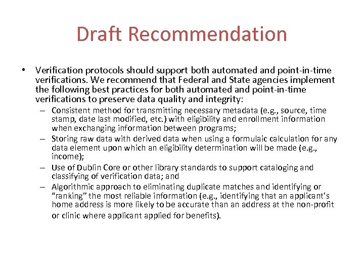 Draft Recommendation • Verification protocols should support both automated and point-in-time verifications. We recommend that Federal and State agencies implement the following best practices for both automated and point-in-time verifications to preserve data quality and integrity: – Consistent method for transmitting necessary metadata (e. g. , source, time stamp, date last modified, etc. ) with eligibility and enrollment information when exchanging information between programs; – Storing raw data with derived data when using a formulaic calculation for any data element upon which an eligibility determination will be made (e. g. , income); – Use of Dublin Core or other library standards to support cataloging and classifying of verification data; and – Algorithmic approach to eliminating duplicate matches and identifying or “ranking” the most reliable information (e. g. , identifying that an applicant’s home address is more likely to be accurate than an address at the non-profit or clinic where applicant applied for benefits).
