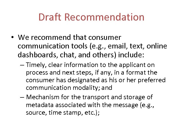 Draft Recommendation • We recommend that consumer communication tools (e. g. , email, text, online dashboards, chat, and others) include: – Timely, clear information to the applicant on process and next steps, if any, in a format the consumer has designated as his or her preferred communication modality; and – Mechanism for the transport and storage of metadata associated with the message (e. g. , source, time stamp, etc. );