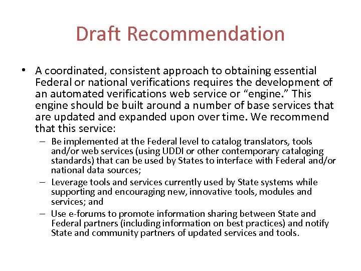 Draft Recommendation • A coordinated, consistent approach to obtaining essential Federal or national verifications requires the development of an automated verifications web service or “engine. ” This engine should be built around a number of base services that are updated and expanded upon over time. We recommend that this service: – Be implemented at the Federal level to catalog translators, tools and/or web services (using UDDI or other contemporary cataloging standards) that can be used by States to interface with Federal and/or national data sources; – Leverage tools and services currently used by State systems while supporting and encouraging new, innovative tools, modules and services; and – Use e-forums to promote information sharing between State and Federal partners (including information on best practices) and notify State and community partners of updated services and tools.