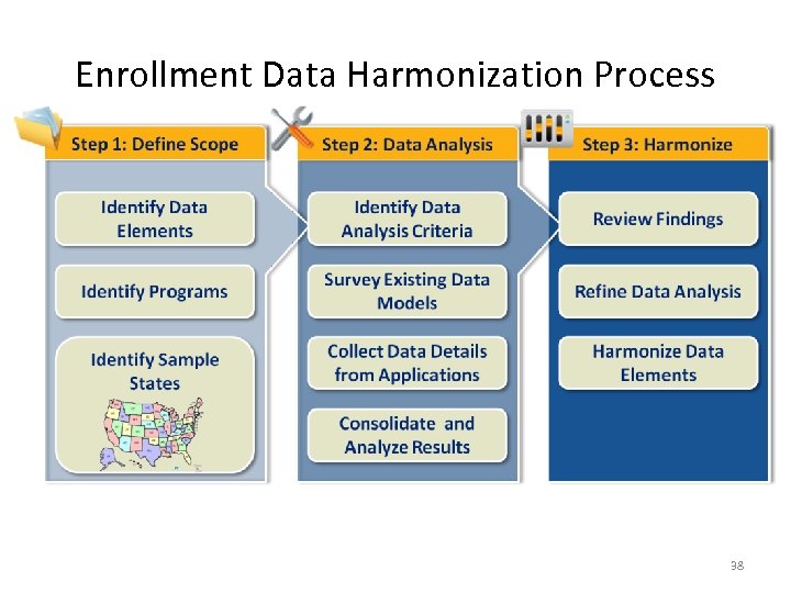 Task Objectives • Survey core enrollment data elements from selected health and human service programs across states • Collect details for core enrollment data elements • Map data elements to existing standards such as HL 7, X 12, and NIEM in order to foster interoperability • Provide recommendations for achieving data element harmonization 37
