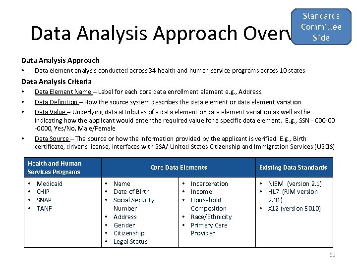 Standards Committee Slide Data Analysis Approach Overview Data Analysis Approach Data element analysis conducted across 34 health and human service programs across 10 states • Data Analysis Criteria Data Element Name – Label for each core data enrollment element e. g. , Address Data Definition – How the source system describes the data element or data element variation Data Value – Underlying data attributes of a data element or data element variation as well as the indicating how the applicant would enter the required value for a specific data element. E. g. , SSN - 000 -00 -0000, Yes/No, Male/Female Data Source – The source or how the information provided by the applicant is verified. E. g. , Birth certificate, driver’s license, interfaces with SSA/ United States Citizenship and Immigration Services (USCIS) • • Health and Human Services Programs • • Medicaid CHIP SNAP TANF Core Data Elements • Name • Date of Birth • Social Security Number • Address • Gender • Citizenship • Legal Status • Incarceration • Income • Household Composition • Race/Ethnicity • Primary Care Provider Existing Data Standards • NIEM (version 2. 1) • HL 7 (RIM version 2. 31) • X 12 (version 5010) 39