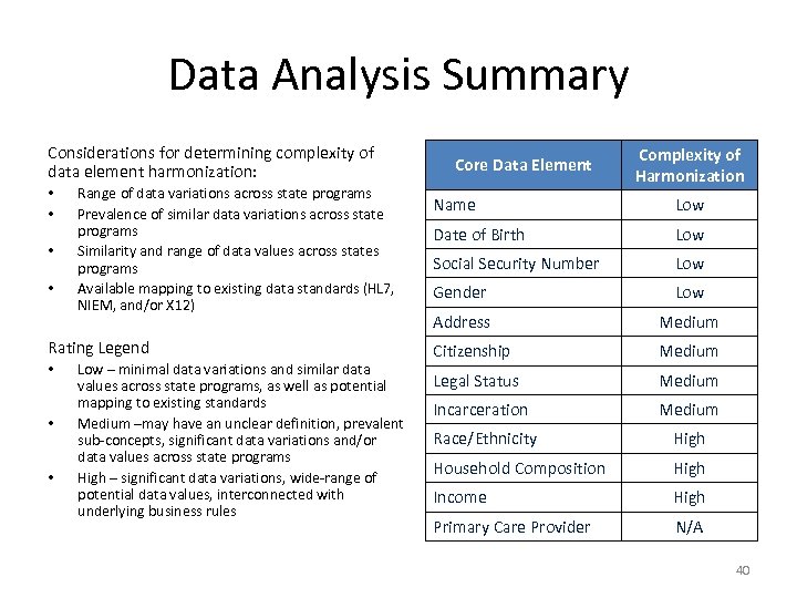 Data Analysis Summary Considerations for determining complexity of data element harmonization: • • Range of data variations across state programs Prevalence of similar data variations across state programs Similarity and range of data values across states programs Available mapping to existing data standards (HL 7, NIEM, and/or X 12) Rating Legend • • • Low – minimal data variations and similar data values across state programs, as well as potential mapping to existing standards Medium –may have an unclear definition, prevalent sub-concepts, significant data variations and/or data values across state programs High – significant data variations, wide-range of potential data values, interconnected with underlying business rules Core Data Element Complexity of Harmonization Name Low Date of Birth Low Social Security Number Low Gender Low Address Medium Citizenship Medium Legal Status Medium Incarceration Medium Race/Ethnicity High Household Composition High Income High Primary Care Provider N/A 40