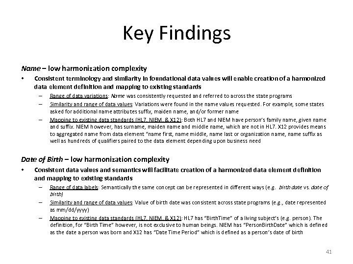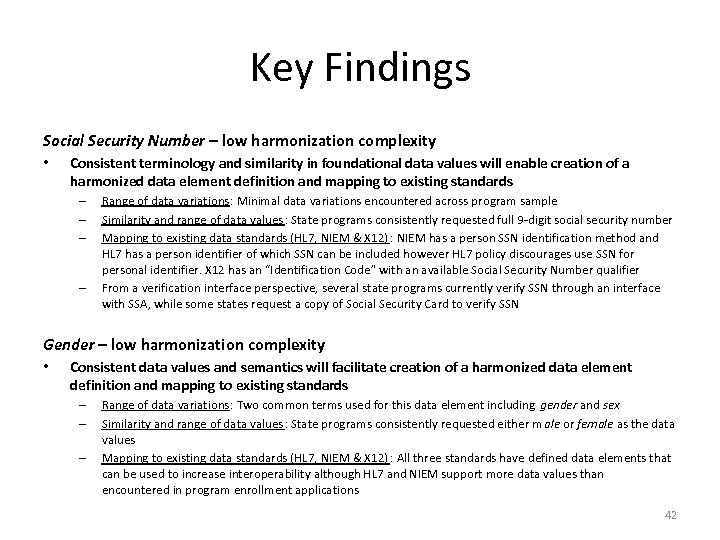 Key Findings Name – low harmonization complexity • Consistent terminology and similarity in foundational data values will enable creation of a harmonized data element definition and mapping to existing standards – – – Range of data variations: Name was consistently requested and referred to across the state programs Similarity and range of data values: Variations were found in the name values requested. For example, some states asked for additional name attributes suffix, maiden name, and/or former name Mapping to existing data standards (HL 7, NIEM, & X 12): Both HL 7 and NIEM have person’s family name, given name and suffix. NIEM however, has surname, maiden name and middle name, which are not in HL 7. X 12 provides means to aggregated name from data element “name first, name middle, name last or organization name, name suffix as well as hundreds of qualifiers paired to the data element depending upon business need Date of Birth – low harmonization complexity • Consistent data values and semantics will facilitate creation of a harmonized data element definition and mapping to existing standards – – – Range of data labels: Semantically the same concept can be represented in different ways (e. g. birth date vs. date of birth) Similarity and range of data values: Value of birth date was consistent across state programs (e. g. , date represented as mm/dd/yyyy) Mapping to existing data standards (HL 7, NIEM, & X 12): HL 7 has “Birth. Time” of a living subject’s (e. g. person). The definition, for “Birth Time” however, is not exclusive to human beings. NIEM has “Person. Birth. Date” which is defined as the date a person was born and X 12 has “Date Time Period” which is defined as a person’s date of birth 41