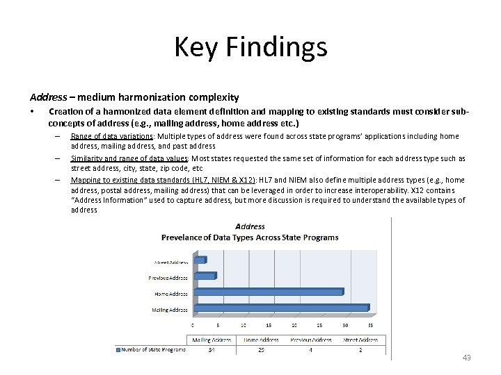 Key Findings Address – medium harmonization complexity • Creation of a harmonized data element definition and mapping to existing standards must consider subconcepts of address (e. g. , mailing address, home address etc. ) – – – Range of data variations: Multiple types of address were found across state programs’ applications including home address, mailing address, and past address Similarity and range of data values: Most states requested the same set of information for each address type such as street address, city, state, zip code, etc Mapping to existing data standards (HL 7, NIEM & X 12): HL 7 and NIEM also define multiple address types (e. g. , home address, postal address, mailing address) that can be leveraged in order to increase interoperability. X 12 contains “Address Information” used to capture address, but more discussion is required to understand the available types of address 43