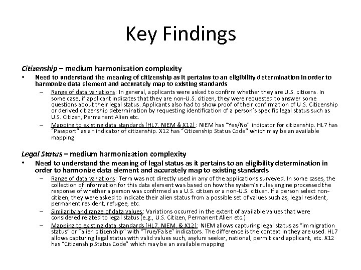 Key Findings Citizenship – medium harmonization complexity • Need to understand the meaning of citizenship as it pertains to an eligibility determination in order to harmonize data element and accurately map to existing standards – Range of data variations: In general, applicants were asked to confirm whether they are U. S. citizens. In – some case, if applicant indicates that they are non-U. S. citizen, they were requested to answer some questions about their legal status. Applicants also had to show proof of their confirmation of U. S. Citizenship or derived citizenship determination by requesting identification of a person’s specific legal status such as U. S. Citizen, Permanent Alien etc. Mapping to existing data standards (HL 7, NIEM & X 12) : NIEM has “Yes/No” indicator for citizenship. HL 7 has “Passport” as an indicator of citizenship. X 12 has “Citizenship Status Code” which may be an available mapping Legal Status – medium harmonization complexity • Need to understand the meaning of legal status as it pertains to an eligibility determination in order to harmonize data element and accurately map to existing standards – – – Range of data variations: Term was not directly used in any of the applications surveyed. In some cases, the collection of information for this data element was based on how the system’s rules engine processed the response of whether a person was confirmed as a U. S. citizen or a non-U. S. citizen. If a person select noncitizen, they were asked to indicate their alien status from a possible set of values such as, legal resident, permanent resident, refugee, etc. Similarity and range of data values: Variations occurred in the extent of available values that were considered related to legal status (e. g. , U. S. Citizen, Permanent Alien etc. ) Mapping to existing data standards (HL 7, NIEM, & X 12) : NIEM allows capturing legal status as “immigration status” or “alien citizenship” with “True/False” indicators. The difference is the context in they are used. HL 7 allows capturing legal status with valid values such, asylum seeker, national, permit card applicant, etc. X 12 has “Citizenship Status Code” which may be an available mapping