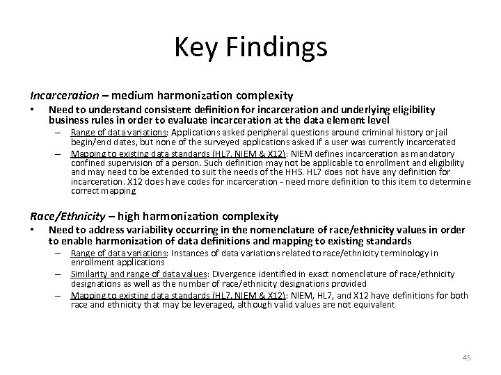 Key Findings Incarceration – medium harmonization complexity • Need to understand consistent definition for incarceration and underlying eligibility business rules in order to evaluate incarceration at the data element level – Range of data variations: Applications asked peripheral questions around criminal history or jail begin/end dates, but none of the surveyed applications asked if a user was currently incarcerated – Mapping to existing data standards (HL 7, NIEM & X 12): NIEM defines incarceration as mandatory confined supervision of a person. Such definition may not be applicable to enrollment and eligibility and may need to be extended to suit the needs of the HHS. HL 7 does not have any definition for incarceration. X 12 does have codes for incarceration - need more definition to this item to determine correct mapping Race/Ethnicity – high harmonization complexity • Need to address variability occurring in the nomenclature of race/ethnicity values in order to enable harmonization of data definitions and mapping to existing standards – Range of data variations: Instances of data variations related to race/ethnicity terminology in enrollment applications – Similarity and range of data values: Divergence identified in exact nomenclature of race/ethnicity designations as well as the number of race/ethnicity designations provided – Mapping to existing data standards (HL 7, NIEM & X 12): NIEM, HL 7, and X 12 have definitions for both race and ethnicity that may be leveraged, although valid values are not equivalent 45