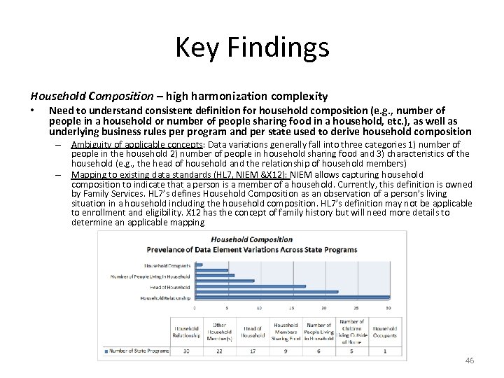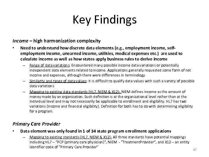Key Findings Household Composition – high harmonization complexity • Need to understand consistent definition for household composition (e. g. , number of people in a household or number of people sharing food in a household, etc. ), as well as underlying business rules per program and per state used to derive household composition – Ambiguity of applicable concepts: Data variations generally fall into three categories 1) number of people in the household 2) number of people in household sharing food and 3) characteristics of the household (e. g. , the head of household and the relationship of household members) – Mapping to existing data standards (HL 7, NIEM &X 12): NIEM allows capturing household composition to indicate that a person is a member of a household. Currently, this definition is owned by Family Services. HL 7’s defines Household Composition as an observation of a person’s living situation in a household including the household composition. HL 7’s definition may not be applicable to enrollment and eligibility. X 12 has the concept of family history but will need more details to determine an applicable mapping 46