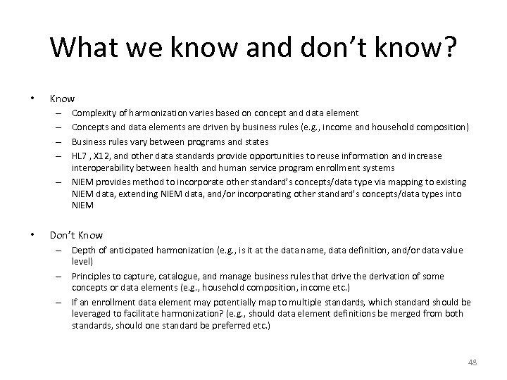 Key Findings Income – high harmonization complexity • Need to understand how discrete data elements (e. g. , employment income, selfemployment income, unearned income, utilities, medical expenses etc. ) are used to calculate income as well as how states apply business rules to derive income – Range of data variations: Encountered many possible income data variations or potentially independent data elements related to income. Applications generally requested some form of net income and expenses, although there were differences in terminology – Similarity and range of data values: It is difficult to qualify data values with such a variety of possible data variations – Mapping to existing data standards (HL 7, NIEM & X 12): NIEM defines income as the amount of money made by an organization. Such definition is at the organizational level rather than at the individual level and may not necessarily be applicable to enrollment and eligibility. HL 7 has two variations (income and financial eligibility). Definition for both has to do with determining eligibility for a program. Primary Care Provider • Data element was only found in 1 of 34 state program enrollment applications – Mapping to existing standards (HL 7, NIEM & X 12): All three standards have potential mappings including HL 7 – “PCP (primary care physician)“, NIEM - “Treatment. Provider”, and X 12 – an entity identifier code of “Primary Care Provider” 47