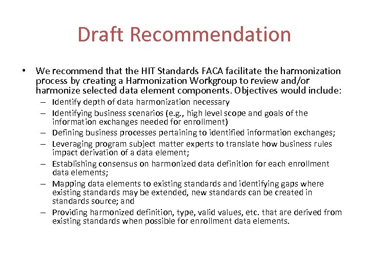 Draft Recommendation • We recommend that the HIT Standards FACA facilitate the harmonization process by creating a Harmonization Workgroup to review and/or harmonize selected data element components. Objectives would include: – Identify depth of data harmonization necessary – Identifying business scenarios (e. g. , high level scope and goals of the information exchanges needed for enrollment) – Defining business processes pertaining to identified information exchanges; – Leveraging program subject matter experts to translate how business rules impact derivation of a data element; – Establishing consensus on harmonized data definition for each enrollment data elements; – Mapping data elements to existing standards and identifying gaps where existing standards may be extended, new standards can be created in standards source; and – Providing harmonized definition, type, valid values, etc. that are derived from existing standards when possible for enrollment data elements.