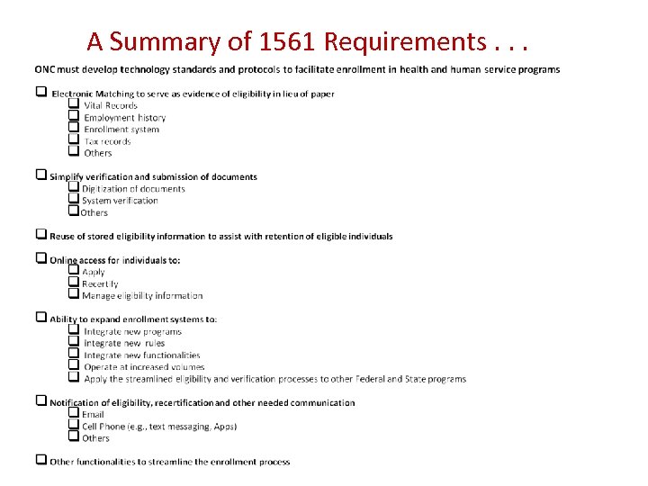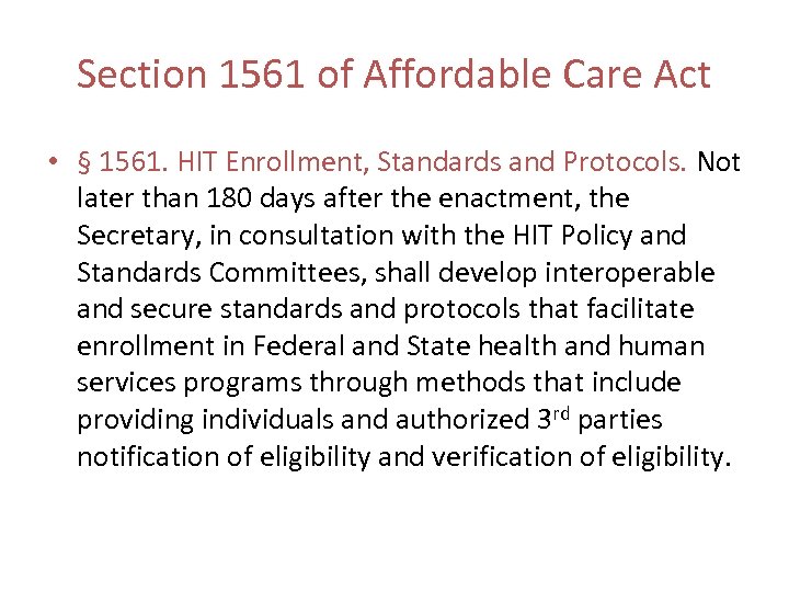 Section 1561 of Affordable Care Act • § 1561. HIT Enrollment, Standards and Protocols. Not later than 180 days after the enactment, the Secretary, in consultation with the HIT Policy and Standards Committees, shall develop interoperable and secure standards and protocols that facilitate enrollment in Federal and State health and human services programs through methods that include providing individuals and authorized 3 rd parties notification of eligibility and verification of eligibility.