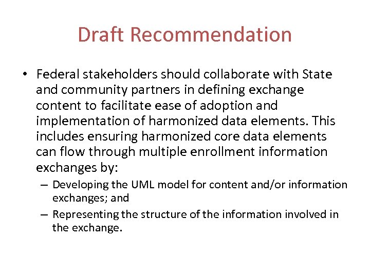 Draft Recommendation • Federal stakeholders should collaborate with State and community partners in defining exchange content to facilitate ease of adoption and implementation of harmonized data elements. This includes ensuring harmonized core data elements can flow through multiple enrollment information exchanges by: – Developing the UML model for content and/or information exchanges; and – Representing the structure of the information involved in the exchange.