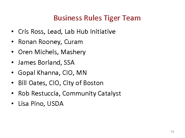 Business Rules Tiger Team • • Cris Ross, Lead, Lab Hub Initiative Ronan Rooney, Curam Oren Michels, Mashery James Borland, SSA Gopal Khanna, CIO, MN Bill Oates, CIO, City of Boston Rob Restuccia, Community Catalyst Lisa Pino, USDA 54