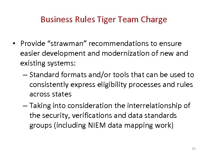 Business Rules Tiger Team Charge • Provide “strawman” recommendations to ensure easier development and modernization of new and existing systems: – Standard formats and/or tools that can be used to consistently express eligibility processes and rules across states – Taking into consideration the interrelationship of the security, verifications and data standards groups (including NIEM data mapping work) 55