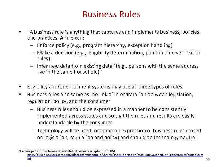 Business Rules • “A business rule is anything that captures and implements business, policies and practices. A rule can: – Enforce policy (e. g. , program hierarchy, exception handling) – Make a decision (e. g. , eligibility determination, point in time verification rules) – Infer new data from existing data” (e. g. , persons with the same address live in the same household)” • • Eligibility and/or enrollment systems may use all three types of rules. Business rules also serve as the link of interpretation between legislation, regulation, policy, and the consumer – Business rules should be expressed in a manner to be consistently implemented across states and so that the rules and results are easily understandable by the consumer – Technology will be used for common expression of business rules (based on legislation, regulation and policy) and should be technology neutral 1 Certain parts of this business rules definition were adapted from BM: http: //publib. boulder. ibm. com/infocenter/dmndhelp/v 6 rxmx/index. jsp? topic=/com. ibm. wbit. help. br. ui. doc/topics/cundbus. ht ml 56