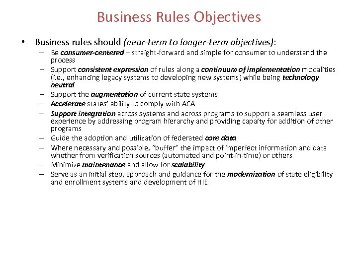 Business Rules Objectives • Business rules should (near-term to longer-term objectives): – Be consumer-centered – straight-forward and simple for consumer to understand the process – Support consistent expression of rules along a continuum of implementation modalities (i. e. , enhancing legacy systems to developing new systems) while being technology neutral – Support the augmentation of current state systems – Accelerate states’ ability to comply with ACA – Support integration across systems and across programs to support a seamless user experience by addressing program hierarchy and providing capaity for addition of other programs – Guide the adoption and utilization of federated core data – Where necessary and possible, “buffer” the impact of imperfect information and data whether from verification sources (automated and point-in-time) or others – Minimize maintenance and allow for scalability – Serve as an initial step, approach and guidance for the modernization of state eligibility and enrollment systems and development of HIE