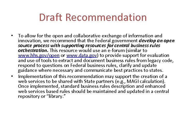 Draft Recommendation • To allow for the open and collaborative exchange of information and innovation, we recommend that the Federal government develop an open source process with supporting resources for central business rules orchestration. This resource would use an e-forum (similar to www. hhs. gov/open or www. data. gov) to provide support for evaluation and use of tools to extract and document business rules from legacy code, respond to questions on Federal business rules, clarify and update guidance where necessary and communicate best practices to states. • Implementation of this recommendation may support the creation of a web services to be shared with State partners (e. g. , MAGI calculation). Once implemented, standard business rules description and enhanced web services based rules should be maintained and updated in a central repository or “library. ”