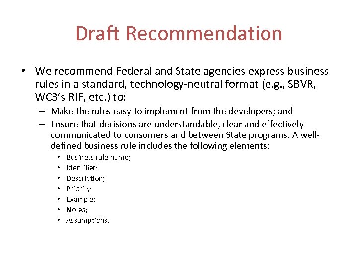 Draft Recommendation • We recommend Federal and State agencies express business rules in a standard, technology-neutral format (e. g. , SBVR, WC 3’s RIF, etc. ) to: – Make the rules easy to implement from the developers; and – Ensure that decisions are understandable, clear and effectively communicated to consumers and between State programs. A welldefined business rule includes the following elements: • • Business rule name; Identifier; Description; Priority; Example; Notes; Assumptions.