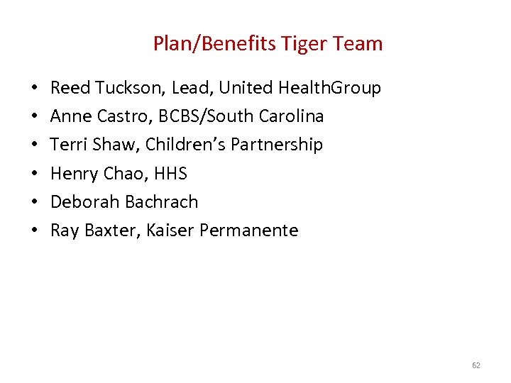Plan/Benefits Tiger Team • • • Reed Tuckson, Lead, United Health. Group Anne Castro, BCBS/South Carolina Terri Shaw, Children’s Partnership Henry Chao, HHS Deborah Bachrach Ray Baxter, Kaiser Permanente 62