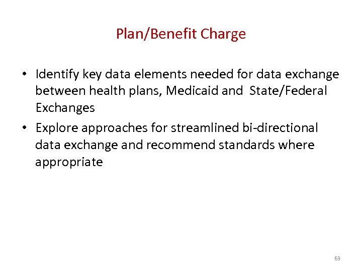 Plan/Benefit Charge • Identify key data elements needed for data exchange between health plans, Medicaid and State/Federal Exchanges • Explore approaches for streamlined bi-directional data exchange and recommend standards where appropriate 63