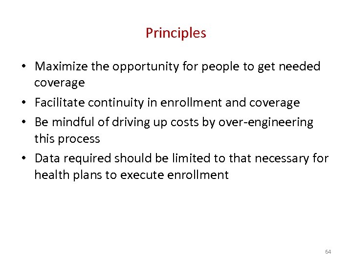 Principles • Maximize the opportunity for people to get needed coverage • Facilitate continuity in enrollment and coverage • Be mindful of driving up costs by over-engineering this process • Data required should be limited to that necessary for health plans to execute enrollment 64