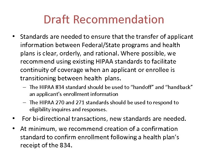 Draft Recommendation • Standards are needed to ensure that the transfer of applicant information between Federal/State programs and health plans is clear, orderly, and rational. Where possible, we recommend using existing HIPAA standards to facilitate continuity of coverage when an applicant or enrollee is transitioning between health plans. – The HIPAA 834 standard should be used to “handoff” and “handback” an applicant’s enrollment information – The HIPAA 270 and 271 standards should be used to respond to eligibility inquires and responses. • For bi-directional transactions, new standards are needed. • At minimum, we recommend creation of a confirmation standard to confirm enrollment following a health plan’s receipt of the 834.