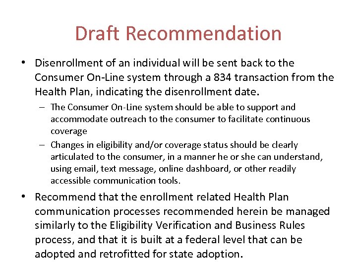 Draft Recommendation • Disenrollment of an individual will be sent back to the Consumer On-Line system through a 834 transaction from the Health Plan, indicating the disenrollment date. – The Consumer On-Line system should be able to support and accommodate outreach to the consumer to facilitate continuous coverage – Changes in eligibility and/or coverage status should be clearly articulated to the consumer, in a manner he or she can understand, using email, text message, online dashboard, or other readily accessible communication tools. • Recommend that the enrollment related Health Plan communication processes recommended herein be managed similarly to the Eligibility Verification and Business Rules process, and that it is built at a federal level that can be adopted and retrofitted for state adoption.