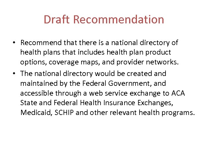 Draft Recommendation • Recommend that there is a national directory of health plans that includes health plan product options, coverage maps, and provider networks. • The national directory would be created and maintained by the Federal Government, and accessible through a web service exchange to ACA State and Federal Health Insurance Exchanges, Medicaid, SCHIP and other relevant health programs.