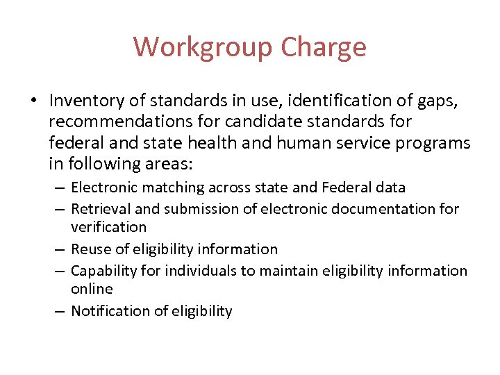 Workgroup Charge • Inventory of standards in use, identification of gaps, recommendations for candidate standards for federal and state health and human service programs in following areas: – Electronic matching across state and Federal data – Retrieval and submission of electronic documentation for verification – Reuse of eligibility information – Capability for individuals to maintain eligibility information online – Notification of eligibility