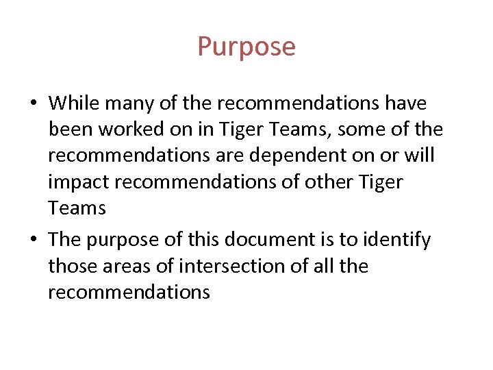 Purpose • While many of the recommendations have been worked on in Tiger Teams, some of the recommendations are dependent on or will impact recommendations of other Tiger Teams • The purpose of this document is to identify those areas of intersection of all the recommendations