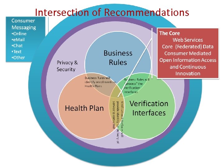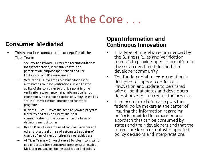 At the Core. . . Consumer Mediated • This is another foundational concept for all the Tiger Teams – – – Security and Privacy – Drives the recommendations for authentication, individual control and participation, purpose specification and use limitations, and ID management Verification – Drives the recommendations for automated real-time verifications, as well as the ability of the consumer to provide point in time verifications when automated information is not consistent with current situation or wrong, as well as “re-use” of verification information for other programs Business Rules – Drives the need to provide program hierarchy and the consistent and clear communication to the consumer on the basis of decisions and outcomes Health Plan – Drives the need for Plan, Provider and other choices real time and automated updates of change of enrollment or other demographic data All Tiger Teams – Drives the need for clear, consistent and understandable consumer messaging through e. Mail, text messaging, online application and others Open Information and Continuous Innovation • • • This type of model is recommended by the Business Rules and Verification teams is to provide open information to the consumer, the states and the developer community The fundamental recommendation is designed to support continuous innovation and update to be shared with all so that states and developers do not have to “re-create” the process The recommendation also puts the federal policy makers at the center of insuring the information regarding policy is provided in a manner and approach that can be consumed by states and their developers and that the forums are kept current with updated policy decisions and interpretations