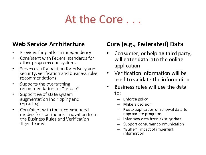 At the Core. . . Web Service Architecture • • • Provides for platform independency Consistent with Federal standards for other programs and systems Serves as a foundation for privacy and security, verification and business rules recommendations Supports the overarching recommendation for “re-use” Supportive of state system augmentation (no ripping and replacing) Consistent with the recommended models for continuous innovation from the Business Rules and Verification Tiger Teams Core (e. g. , Federated) Data • Consumer, or helping third party, will enter data into the online application • Verification information will be used to validate the information • Business rules will use the data to: – Enforce policy – Make a decision – Route application or renewal data to appropriate programs – Infer new data from existing data – Support consumer communication – “Buffer” impact of imperfect information