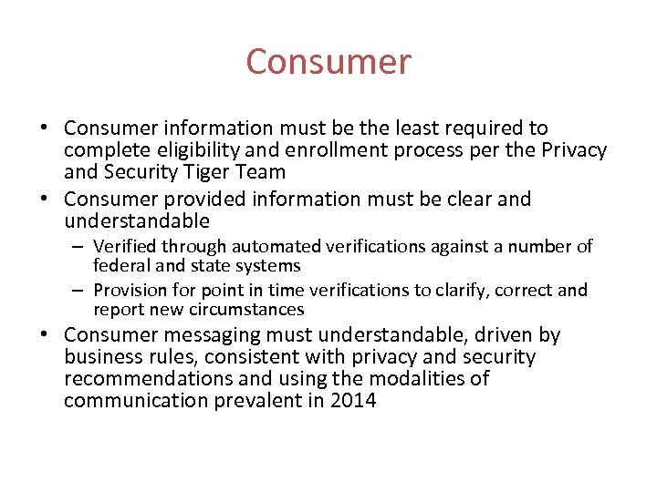 Consumer • Consumer information must be the least required to complete eligibility and enrollment process per the Privacy and Security Tiger Team • Consumer provided information must be clear and understandable – Verified through automated verifications against a number of federal and state systems – Provision for point in time verifications to clarify, correct and report new circumstances • Consumer messaging must understandable, driven by business rules, consistent with privacy and security recommendations and using the modalities of communication prevalent in 2014