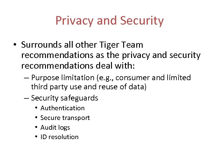 Privacy and Security • Surrounds all other Tiger Team recommendations as the privacy and security recommendations deal with: – Purpose limitation (e. g. , consumer and limited third party use and reuse of data) – Security safeguards • • Authentication Secure transport Audit logs ID resolution