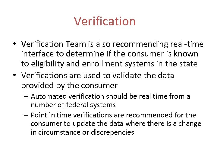 Verification • Verification Team is also recommending real-time interface to determine if the consumer is known to eligibility and enrollment systems in the state • Verifications are used to validate the data provided by the consumer – Automated verification should be real time from a number of federal systems – Point in time verifications are recommended for the consumer to update the data where there is a change in circumstance or discrepencies