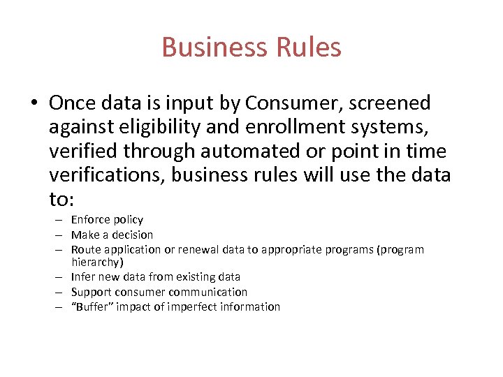 Business Rules • Once data is input by Consumer, screened against eligibility and enrollment systems, verified through automated or point in time verifications, business rules will use the data to: – Enforce policy – Make a decision – Route application or renewal data to appropriate programs (program hierarchy) – Infer new data from existing data – Support consumer communication – “Buffer” impact of imperfect information