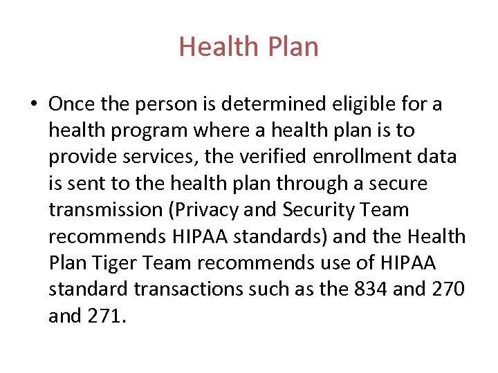 Health Plan • Once the person is determined eligible for a health program where a health plan is to provide services, the verified enrollment data is sent to the health plan through a secure transmission (Privacy and Security Team recommends HIPAA standards) and the Health Plan Tiger Team recommends use of HIPAA standard transactions such as the 834 and 270 and 271.