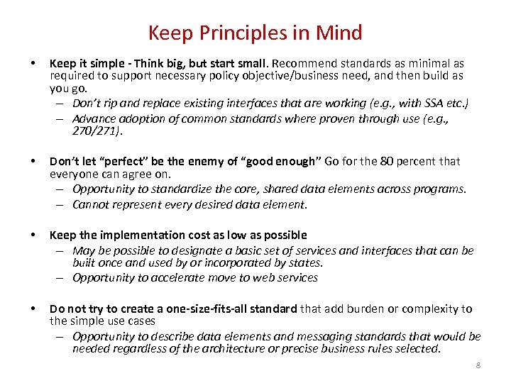 Keep Principles in Mind • Keep it simple - Think big, but start small. Recommend standards as minimal as required to support necessary policy objective/business need, and then build as you go. – Don’t rip and replace existing interfaces that are working (e. g. , with SSA etc. ) – Advance adoption of common standards where proven through use (e. g. , 270/271). • Don’t let “perfect” be the enemy of “good enough” Go for the 80 percent that everyone can agree on. – Opportunity to standardize the core, shared data elements across programs. – Cannot represent every desired data element. • Keep the implementation cost as low as possible – May be possible to designate a basic set of services and interfaces that can be built once and used by or incorporated by states. – Opportunity to accelerate move to web services • Do not try to create a one-size-fits-all standard that add burden or complexity to the simple use cases – Opportunity to describe data elements and messaging standards that would be needed regardless of the architecture or precise business rules selected. 8