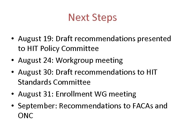 Next Steps • August 19: Draft recommendations presented to HIT Policy Committee • August 24: Workgroup meeting • August 30: Draft recommendations to HIT Standards Committee • August 31: Enrollment WG meeting • September: Recommendations to FACAs and ONC