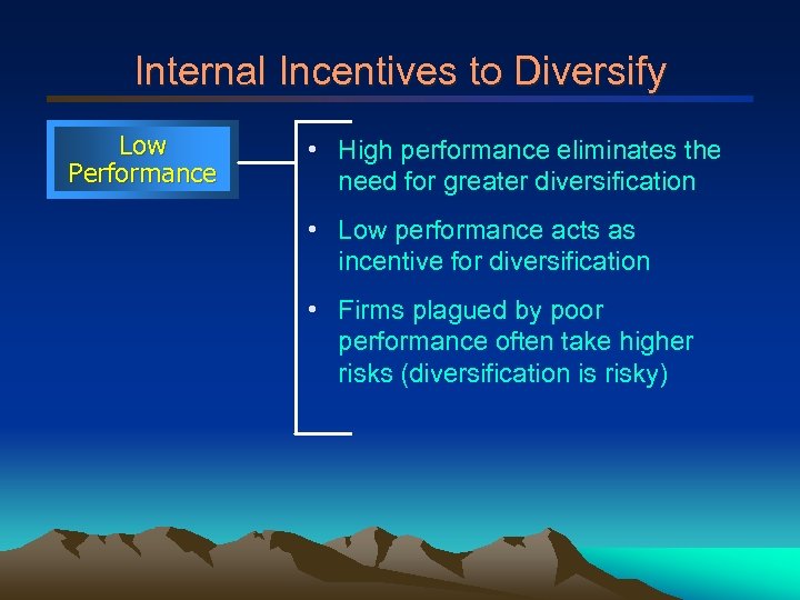 Internal Incentives to Diversify Low Performance • High performance eliminates the need for greater diversification • Low performance acts as incentive for diversification • Firms plagued by poor performance often take higher risks (diversification is risky)