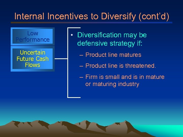 Internal Incentives to Diversify (cont’d) Low Performance • Diversification may be defensive strategy if: Uncertain Future Cash Flows – Product line matures – Product line is threatened. – Firm is small and is in mature or maturing industry