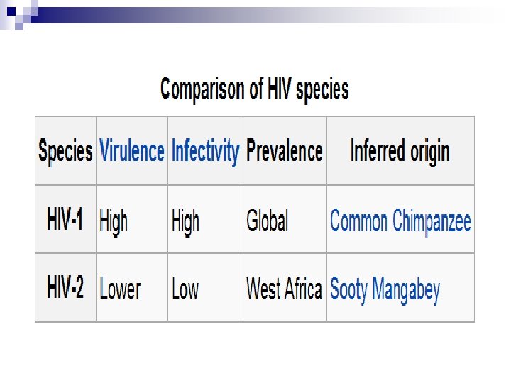 Characteristics of the virus n n Icosahedra (20 sided), enveloped virus of the lentivirus subfamily of retroviruses. Two viral strands of RNA found in core surrounded by protein outer coat. ¨ Outer envelope contains a lipid matrix within which specific viral glycoproteins are imbedded. ¨ These knob-like structures responsible for binding to target cell.