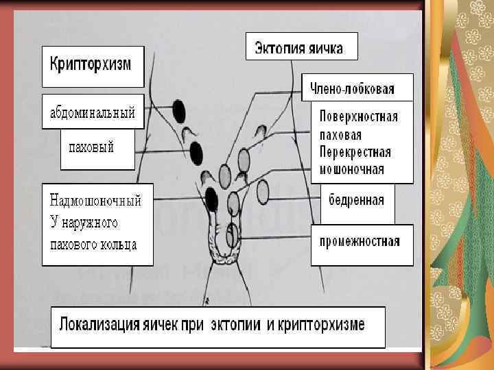 Одна из основных проблем детской андрологии. в буквальном смысле термин «крипторхизм» означает «спрятанное яичко» . Это явление заключается в неопущении яичек (или яичка) в мошонку, при этом яичко задерживается в брюшной полости или паховом канале. Несмотря на то, что проблема крипторхизма исследуется уже более 100 лет, многие ее аспекты остаются до сих пор невыясненными и спорными.