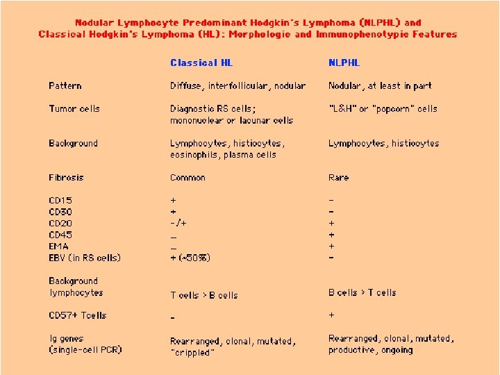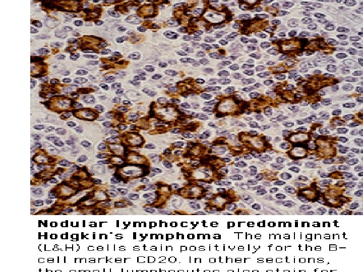 Immunophenotype in HD : The immunophenotype is an important part of the definition of NLPHL. The atypical cells are CD 45+ , express B - cell associated antigens ( CD 19 , CD 20 , CD 22 , CD 79 a ) , and EMA but lack CD 15 and CD 30.