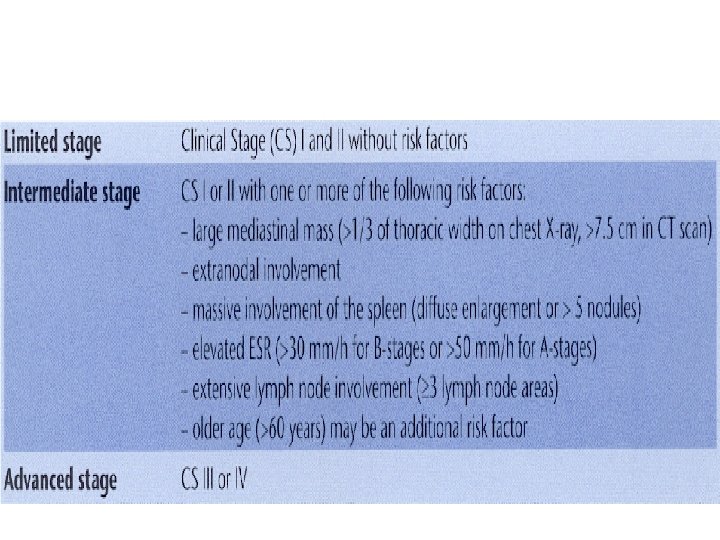 Poor prognose sign & symptome in HD • B symptoms Clinical stage IIB to IVB Bulky disease Anemia Leukopenia Thrombocytopenia • **