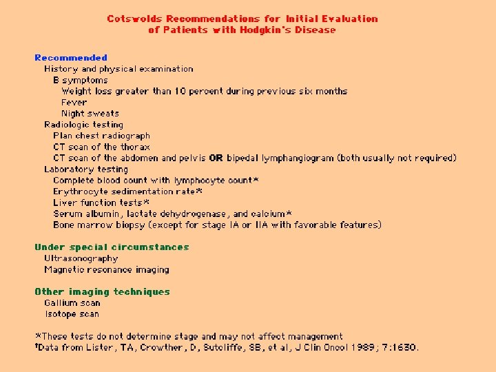 Initial evaluation and diagnosis of Hodgkin's disease HISTORY AND PHYSICAL EXAMINATION TISSUE BIOPSY Bone marrow biopsy LABORATORY STUDIES IMAGING STUDIES: chest, abdomen, liver, spleen, bone. Gastrointestinal tract Central nervous system