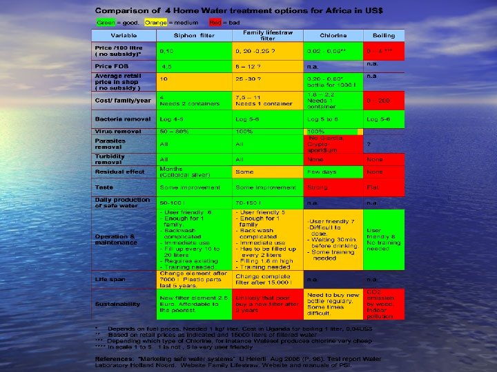 Data on next slides Users = estimated number of users by 2009 Price = retailprice in shops Cost = cost / person / year (based on 3 liters of drinkingwater/ person/ day) + = Advantages - = Disadvantages