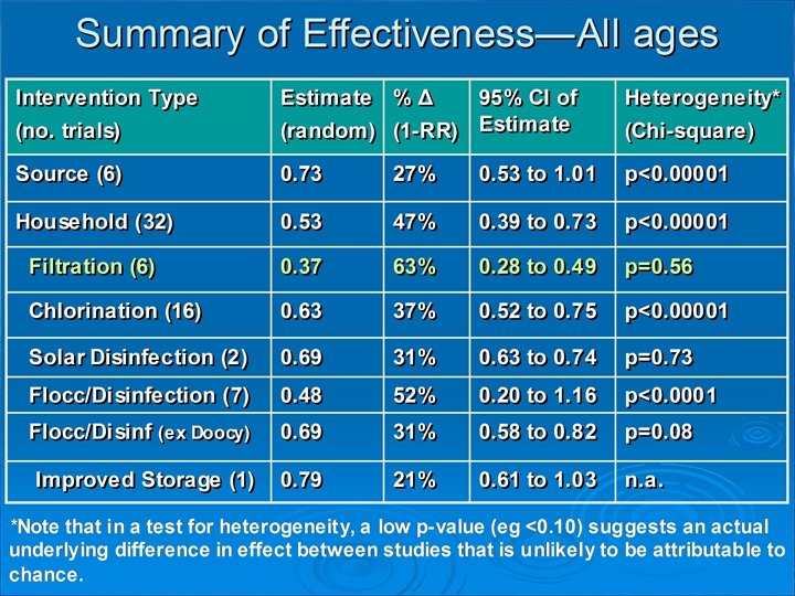 No option is ‘the’ solution • Boiling Filtering Chemicals Combined Chemical (PUR) UV SODIS Turbidity Heavy Metals Viruses Bacteria Parasites Pesticides